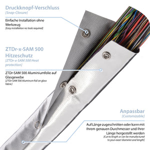 The ZTDr-X-SAM 500 is a robust protective conduit for permanent heat protection and reliable cable protection in demanding industrial environments. The material consists of aluminum-coated E-glass fabric laminated with a specially developed ZT Flex-HT 260 silicone adhesive. Stainless steel snap fasteners allow for tool-free installation and flexible, precise routing, even in confined spaces.