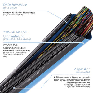 ZTD-GP-0,35-BL ist eine flexible Kabelummantelung auf Basis der weichen PVC-Folie GP-035-BL in blauer Ausführung mit mechanisch stabilem D-Verschluss für anspruchsvolle industrielle Anwendungen. Das Material basiert auf weicher, selbstverlöschender PVC-Folie, die sich durch hohe Flexibilität, Abriebfestigkeit und Widerstand gegen Flüssigkeiten, Chemikalien, UV-Strahlung und Ozon auszeichnet.